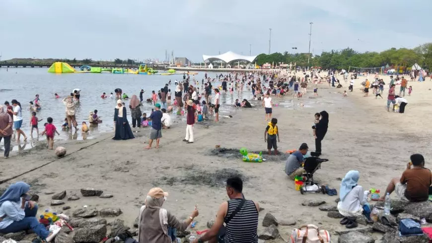 Seperti yang terlihat pada Minggu (29/3/2028) atau H+8 lebaran, tempat wisata yang berada di utara Jakarta ini dipadati ramai pengunjung. Kepadatan mulai terlihat dari pintu. Kendaraan bermotor, baik mobil dan motor antre memanjang di pintu masuk. Kendaraan juga berjejer terparkir di sepanjang jalan depan pintu masuk kawasan pantai.