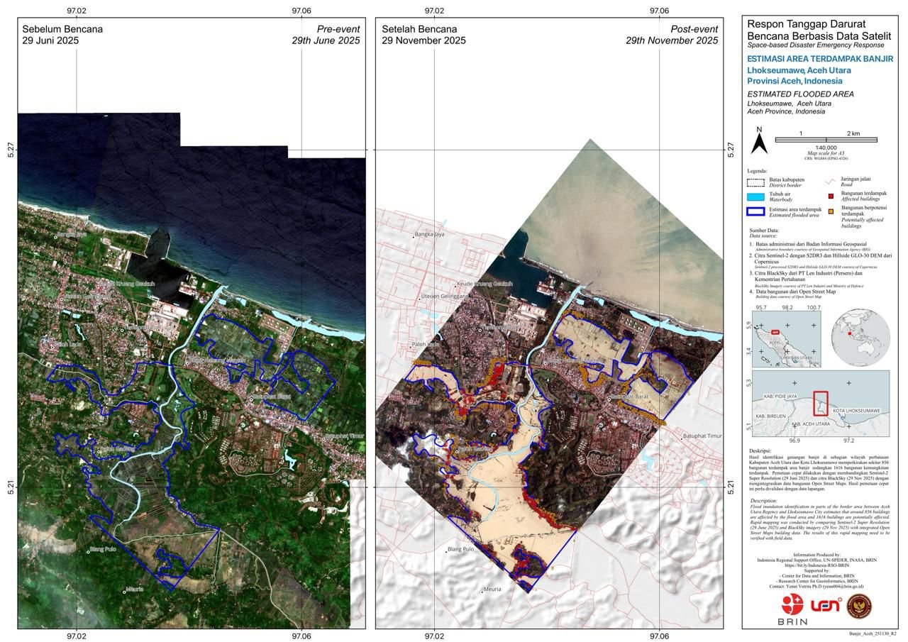 Melalui proses pemetaan cepat, Len mengidentifikasi tingkat kerusakan di sejumlah wilayah terdampak. Di perbatasan Kabupaten Aceh Utara dan Kota Lhokseumawe, terdeteksi sekitar 856 bangunan terdampak banjir dan 1.616 bangunan berpotensi terdampak. Di Kabupaten Takengon, analisis menemukan sekitar 50 titik longsor dan 5 ruas jalan yang terputus. Sementara itu, di Kabupaten Bireuen, teridentifikasi sekitar 413 bangunan terdampak banjir serta 796 bangunan yang berpotensi terdampak. Seluruh pemetaan ini dilakukan melalui perbandingan citra Sentinel-2 Very High Resolution, Mosaic Planet, dan BlackSky yang terintegrasi dengan data Open Street Map.